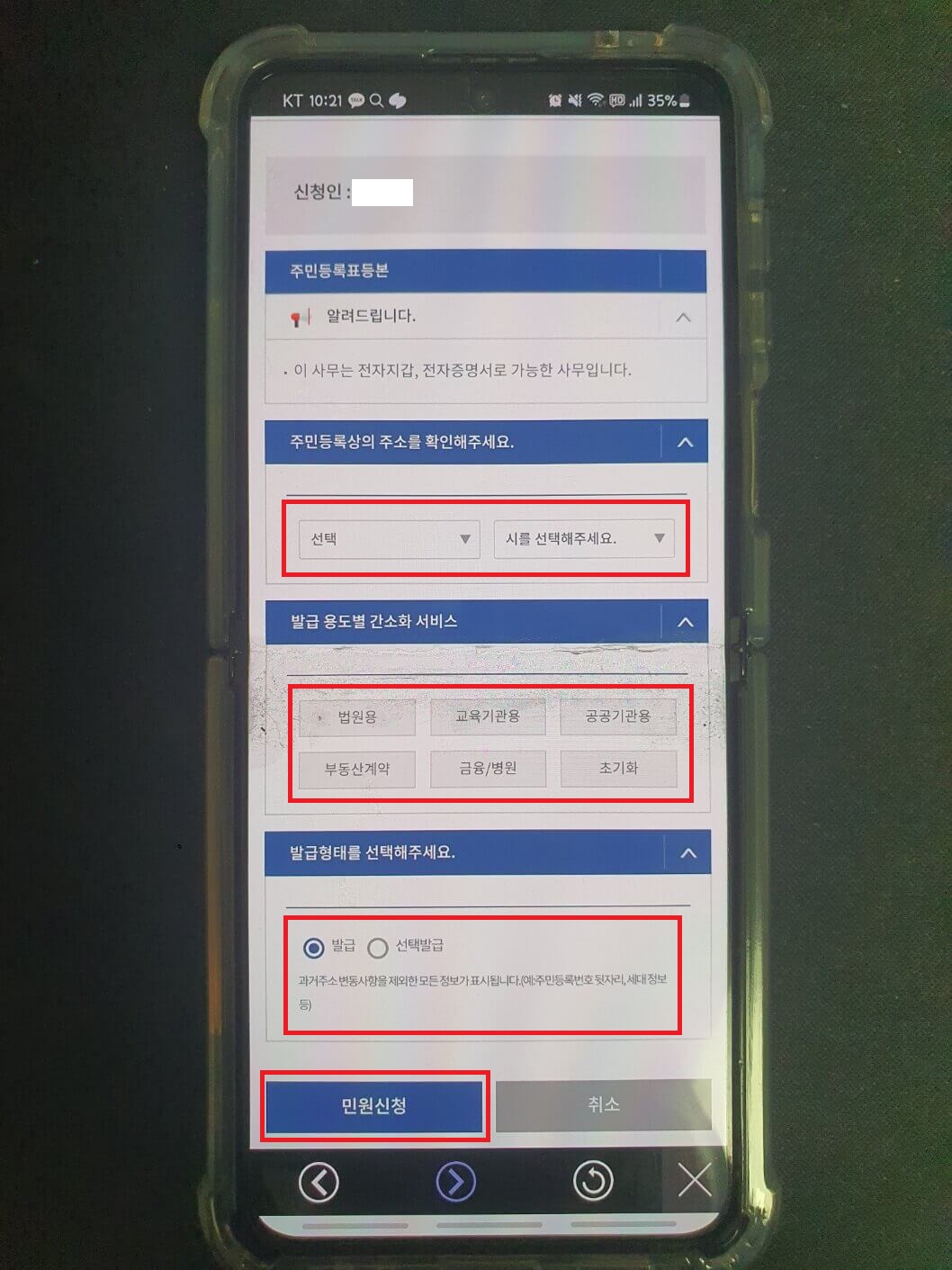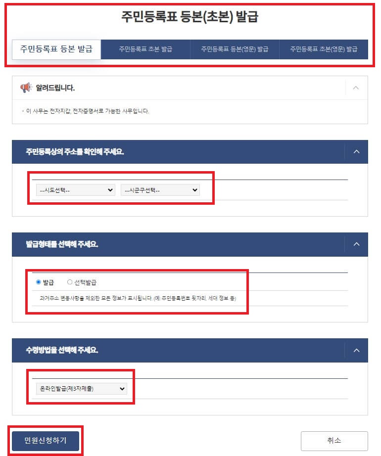 저는 우선 비회원으로 신청을 해봤는데요, 비회원일 경우 좌측의 사진처럼 개인정보를 입력하는 과정이 추가됩니다. 필수 정보를 입력한 후 확인버튼을 눌러주면 발급 화면으로 넘어가는데요. 여기서 등본이나 초본 중 발급받을 서류를 선택하고 아래 주민등록상 주소지를 선택, 발급형태와 수령방법을 선택 후 민원신청하기 버튼을 눌러주시면 됩니다. 여기서 수령방법은 꼭 온라인발급으로 해주셔야 하니 잊지 마시기 바랍니다.