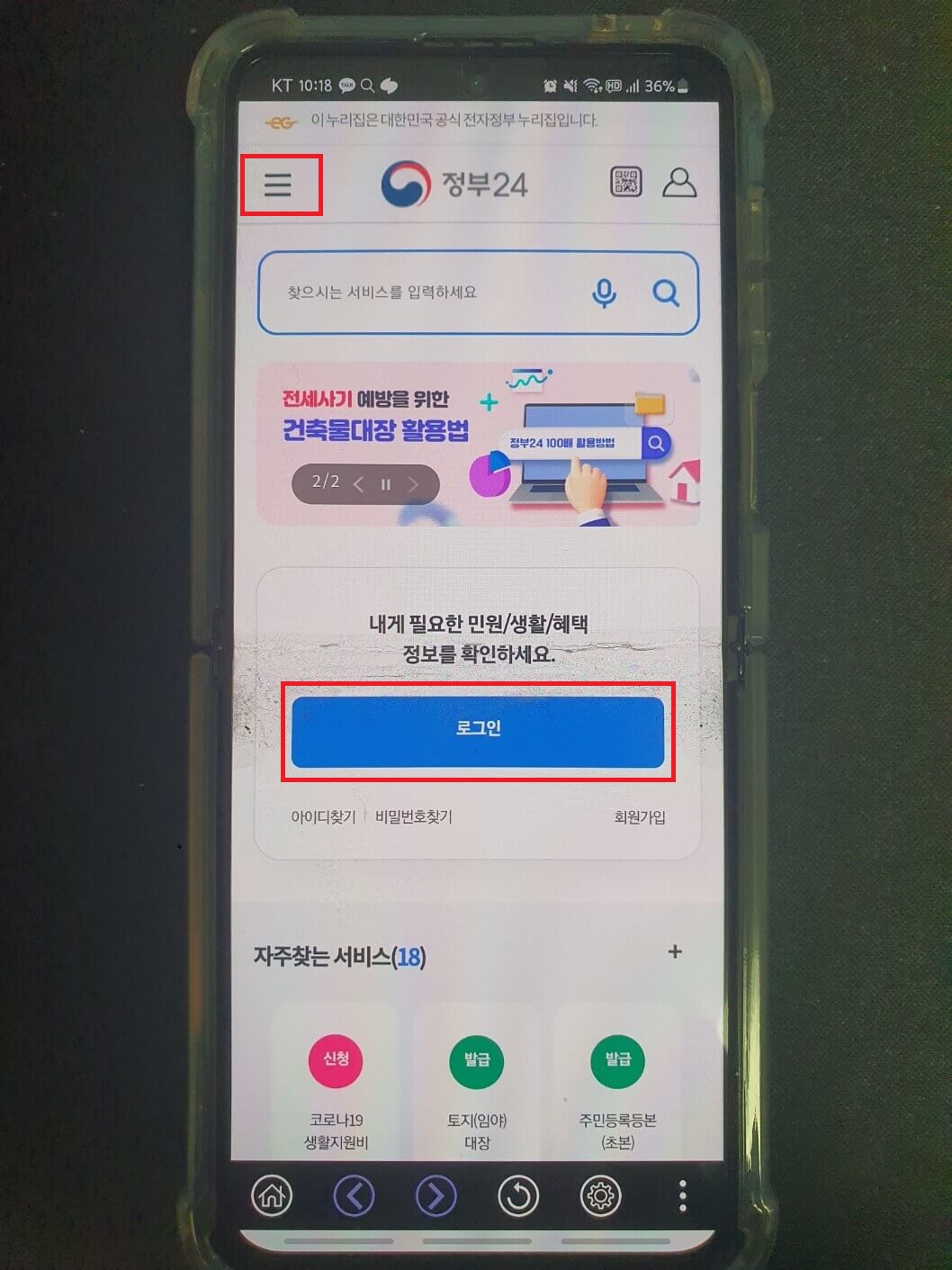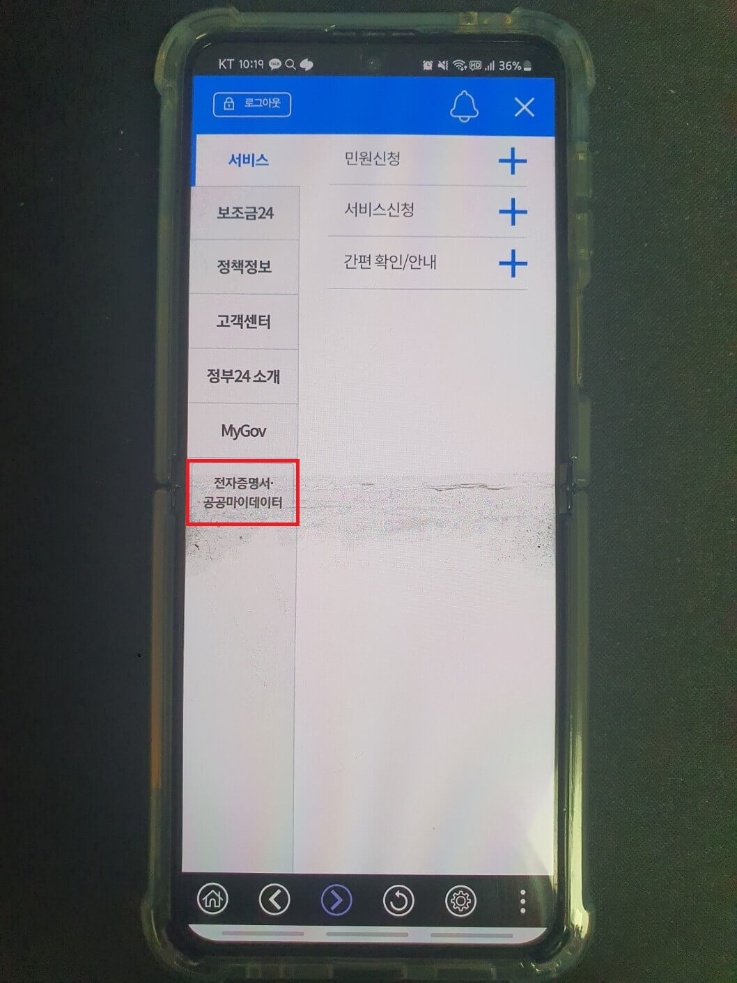 설치 후 정부24 앱을 실행시켜주시면 위와 같은 화면을 볼 수 있는데요. 로그인 버튼을 눌러서 좌측 상단 버튼을 눌러줍니다. 그리고 전자증명서·공공마이데이터를 눌러주세요. 만약 회원가입이 되어있지 않아 로그인을 할 수 없다면 아래 링크를 통해 회원가입을 진행해주시면 됩니다.