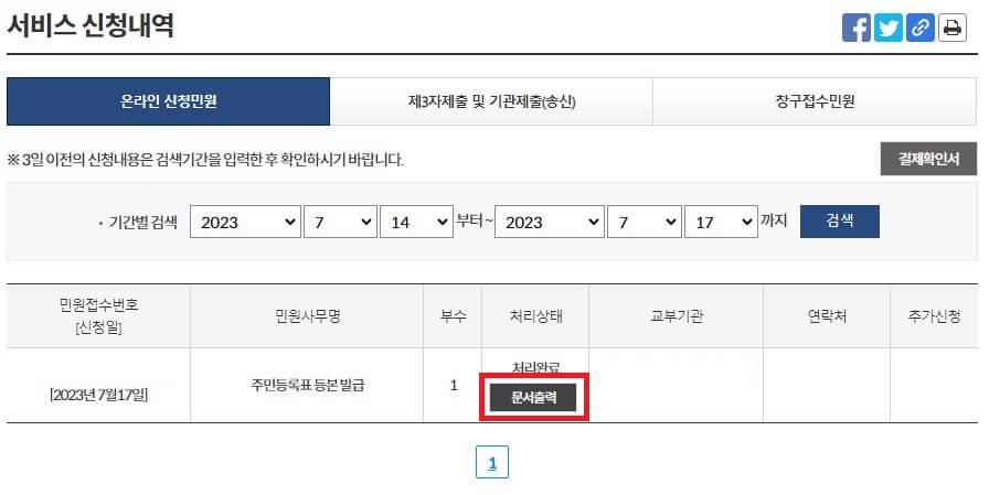 민원신청하기 버튼을 누르면 위와 같은 화면을 볼 수 있는데요. 여기서 문서출력 버튼을 누른 뒤, 프린터로 출력을 해도 되고 PDF로 저장할 경우 USB나 모바일에 넣고 들고 다닐 수도 있으며 메일로 보낼 수도 있으니 다양한 방법으로 활용하시면 됩니다.